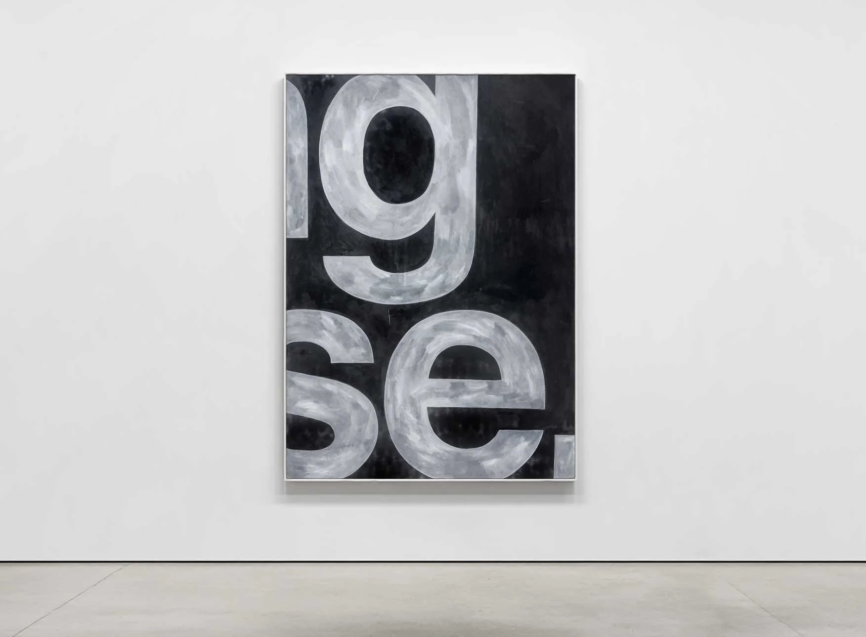 Overscaled typographic forms are rendered on canvas and plywood, cropped by the boundaries of each support. The works suggest language without resolving into legible text—centralizing fragments of familiar letterforms that resist completion.
